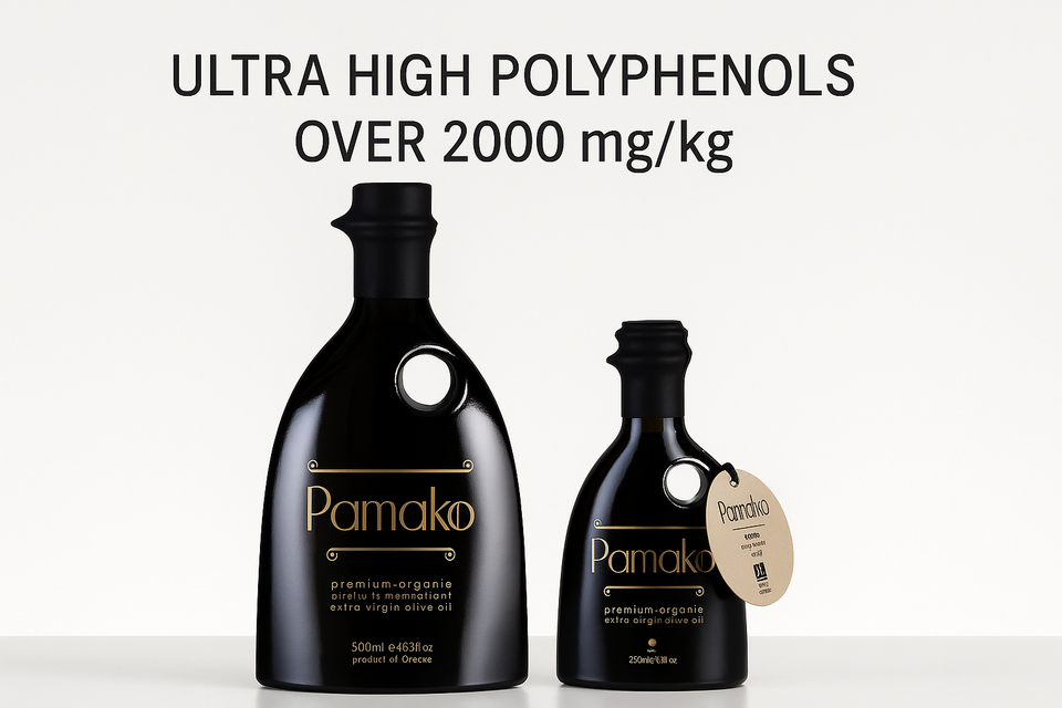 Discover the power of Pamako Ultra High Polyphenol Olive Oil—certified for its health benefits under EU Regulation 432/2012 and packed with over 2000 mg/kg of antioxidants like oleocanthal and hydroxytyrosol. Cold-pressed from ancient Tsounati olives and elegantly bottled for purity, Pamako offers the perfect blend of wellness, tradition, and premium taste. Nourish your body.